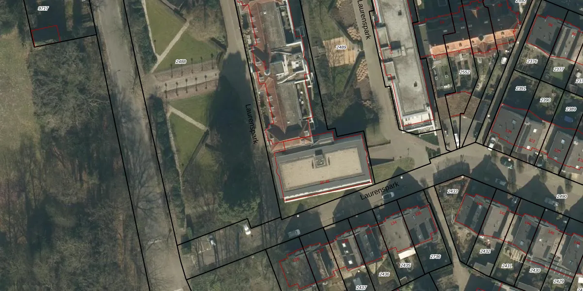 Het perceel waarop Laurenspark 36 staat heeft een oppervlakte van 2896 m². Dit is een zeer groot perceel. De perceeloppervlakte wordt geregistreerd door het Kadaster. Gedetailleerde informatie over de maten van dit perceel kunt u vinden in het rapport Kadastrale kaart met maatvoering van Laurenspark 36.