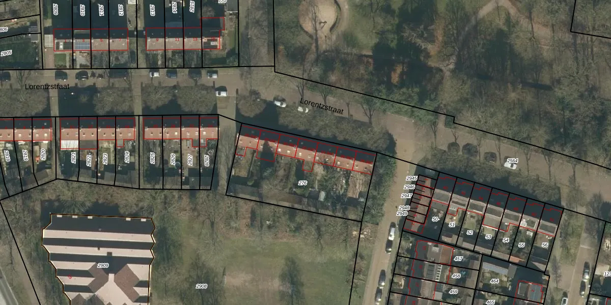Het perceel waarop Lorentzstraat 32-A staat heeft een oppervlakte van 1071 m². Dit is een zeer groot perceel. De perceeloppervlakte wordt geregistreerd door het Kadaster. Gedetailleerde informatie over de maten van dit perceel kunt u vinden in het rapport Kadastrale kaart met maatvoering van Lorentzstraat 32-A.