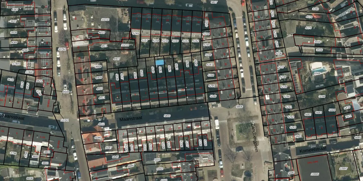 Maanstraat 15 is gelegen op kadastraal perceel BDA00D5043. Deze kadastrale aanduiding is uniek en wordt gebruikt door het Kadaster om eigendomsrechten en andere zakelijke rechten vast te leggen. Het perceel maakt onderdeel uit van de kadastrale gemeente Breda.