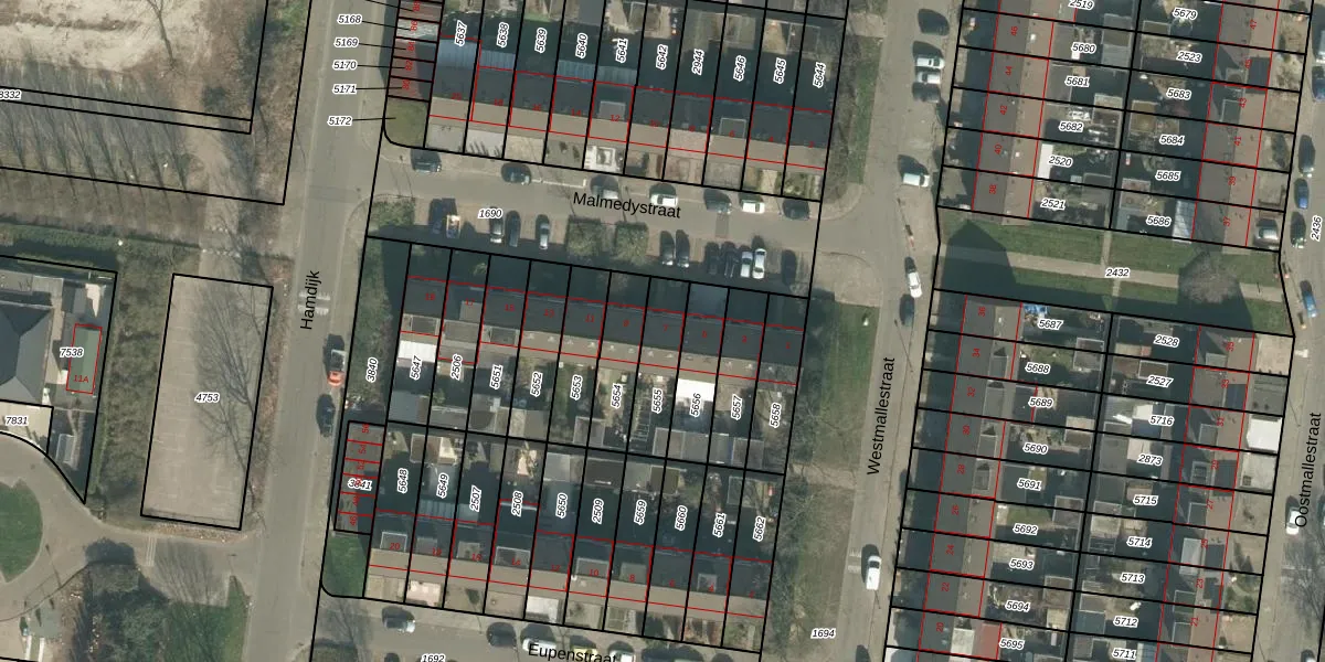 Malmedystraat 7 is gelegen op kadastraal perceel BDA00G5655. Deze kadastrale aanduiding is uniek en wordt gebruikt door het Kadaster om eigendomsrechten en andere zakelijke rechten vast te leggen. Het perceel maakt onderdeel uit van de kadastrale gemeente Breda.