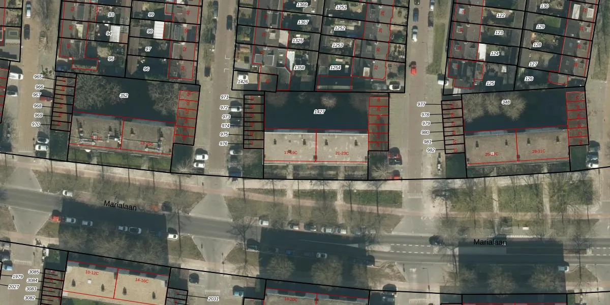 Het perceel waarop Marialaan 19 staat heeft een oppervlakte van 1115 m². Dit is een zeer groot perceel. De perceeloppervlakte wordt geregistreerd door het Kadaster. Gedetailleerde informatie over de maten van dit perceel kunt u vinden in het rapport Kadastrale kaart met maatvoering van Marialaan 19.