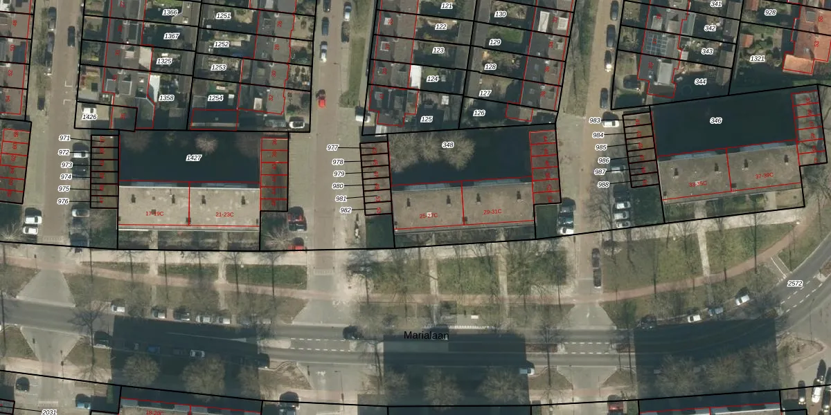 Het perceel waarop Marialaan 25-B staat heeft een oppervlakte van 1066 m². Dit is een zeer groot perceel. De perceeloppervlakte wordt geregistreerd door het Kadaster. Gedetailleerde informatie over de maten van dit perceel kunt u vinden in het rapport Kadastrale kaart met maatvoering van Marialaan 25-B.