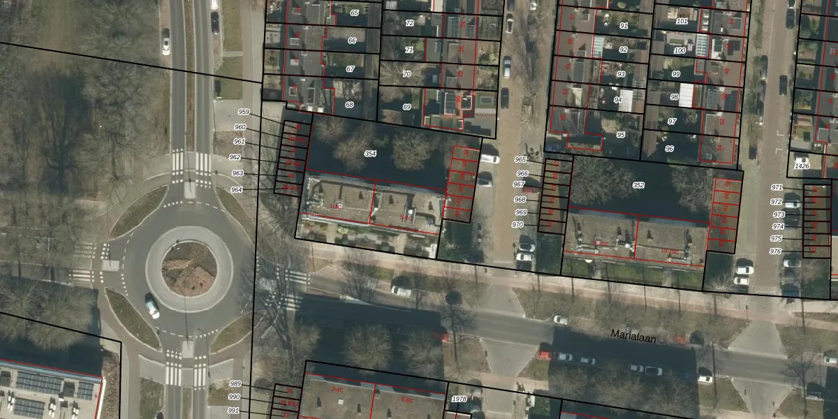 Het perceel waarop Marialaan 7-A staat heeft een oppervlakte van 1168 m². Dit is een zeer groot perceel. De perceeloppervlakte wordt geregistreerd door het Kadaster. Gedetailleerde informatie over de maten van dit perceel kunt u vinden in het rapport Kadastrale kaart met maatvoering van Marialaan 7-A.