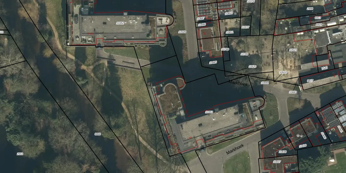 Het perceel waarop Markhoek 65 staat heeft een oppervlakte van 2842 m². Dit is een zeer groot perceel. De perceeloppervlakte wordt geregistreerd door het Kadaster. Gedetailleerde informatie over de maten van dit perceel kunt u vinden in het rapport Kadastrale kaart met maatvoering van Markhoek 65.