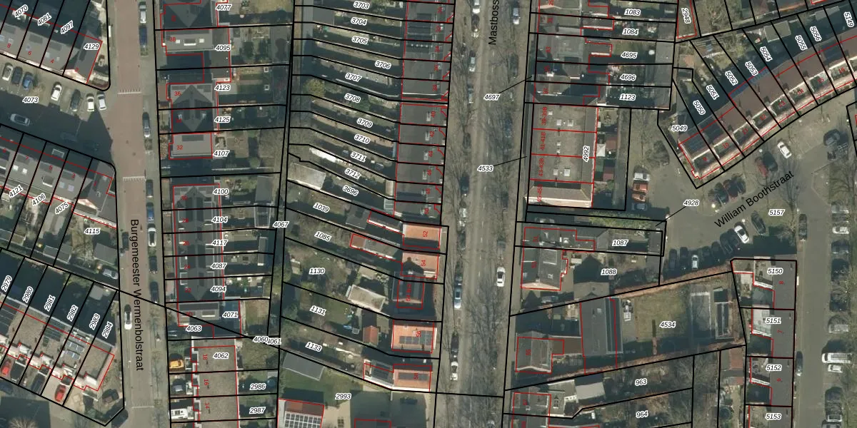 Het perceel waarop Mastbosstraat 50 staat heeft een oppervlakte van 182 m². Dit is een middelgroot perceel. De perceeloppervlakte wordt geregistreerd door het Kadaster. Gedetailleerde informatie over de maten van dit perceel kunt u vinden in het rapport Kadastrale kaart met maatvoering van Mastbosstraat 50.