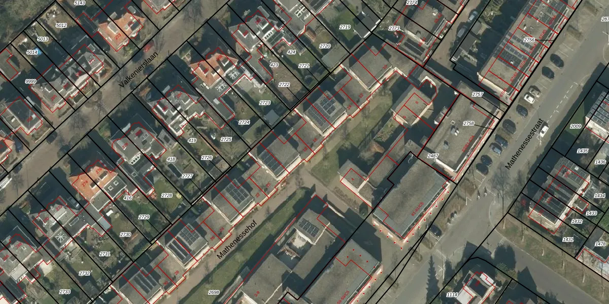 Het perceel waarop Mathenessehof 18 staat heeft een oppervlakte van 6687 m². Dit is een zeer groot perceel. De perceeloppervlakte wordt geregistreerd door het Kadaster. Gedetailleerde informatie over de maten van dit perceel kunt u vinden in het rapport Kadastrale kaart met maatvoering van Mathenessehof 18.