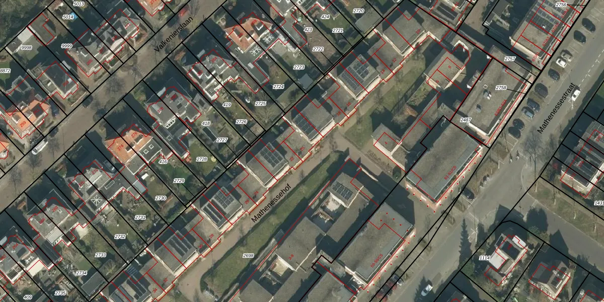 Het perceel waarop Mathenessehof 20 staat heeft een oppervlakte van 6687 m². Dit is een zeer groot perceel. De perceeloppervlakte wordt geregistreerd door het Kadaster. Gedetailleerde informatie over de maten van dit perceel kunt u vinden in het rapport Kadastrale kaart met maatvoering van Mathenessehof 20.