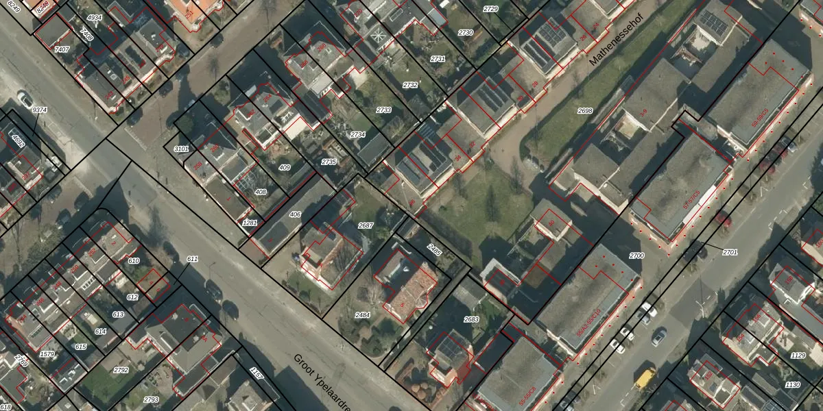 Het perceel waarop Mathenessehof 36 staat heeft een oppervlakte van 6687 m². Dit is een zeer groot perceel. De perceeloppervlakte wordt geregistreerd door het Kadaster. Gedetailleerde informatie over de maten van dit perceel kunt u vinden in het rapport Kadastrale kaart met maatvoering van Mathenessehof 36.