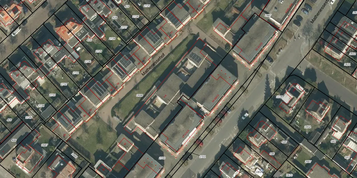 Het perceel waarop Mathenessehof 5 staat heeft een oppervlakte van 6687 m². Dit is een zeer groot perceel. De perceeloppervlakte wordt geregistreerd door het Kadaster. Gedetailleerde informatie over de maten van dit perceel kunt u vinden in het rapport Kadastrale kaart met maatvoering van Mathenessehof 5.