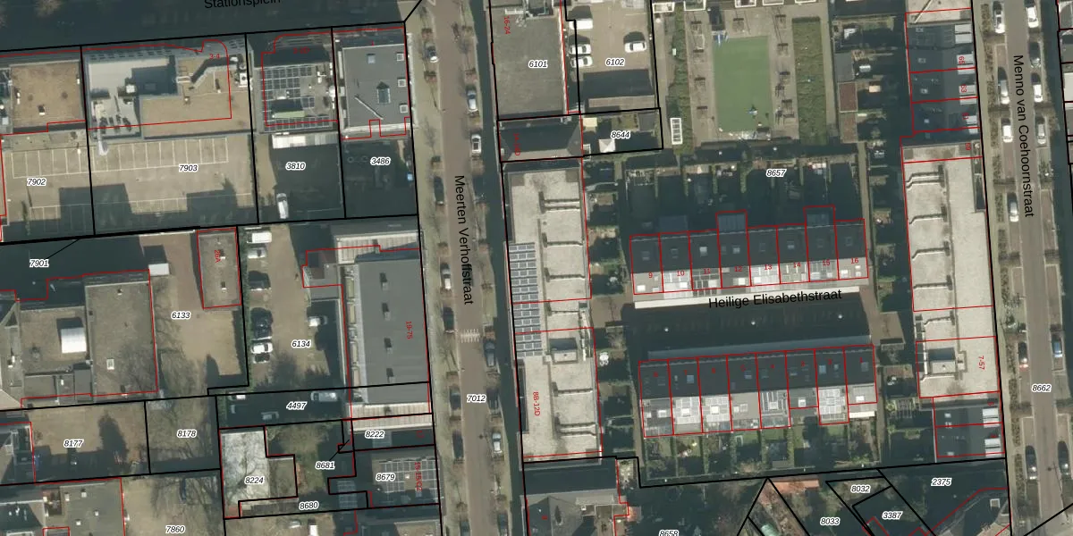 Het perceel waarop Meerten Verhoffstraat 10-C13 staat heeft een oppervlakte van 8208 m². Dit is een zeer groot perceel. De perceeloppervlakte wordt geregistreerd door het Kadaster. Gedetailleerde informatie over de maten van dit perceel kunt u vinden in het rapport Kadastrale kaart met maatvoering van Meerten Verhoffstraat 10-C13.
