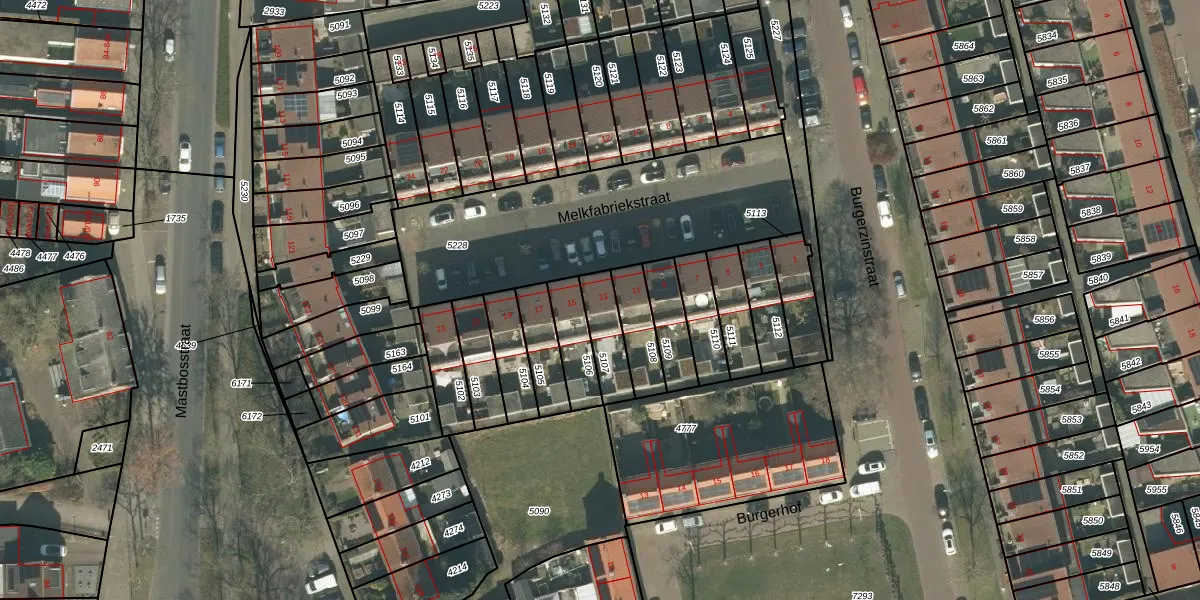 Het perceel waarop Melkfabriekstraat 13 staat heeft een oppervlakte van 119 m². Dit is een middelgroot perceel. De perceeloppervlakte wordt geregistreerd door het Kadaster. Gedetailleerde informatie over de maten van dit perceel kunt u vinden in het rapport Kadastrale kaart met maatvoering van Melkfabriekstraat 13.