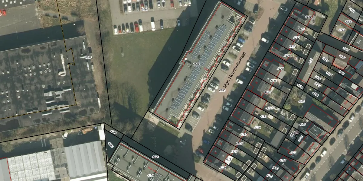 Mgr. Horsthuisstraat 21 is gelegen op kadastraal perceel PCH00H4144. Deze kadastrale aanduiding is uniek en wordt gebruikt door het Kadaster om eigendomsrechten en andere zakelijke rechten vast te leggen. Het perceel maakt onderdeel uit van de kadastrale gemeente Princenhage.