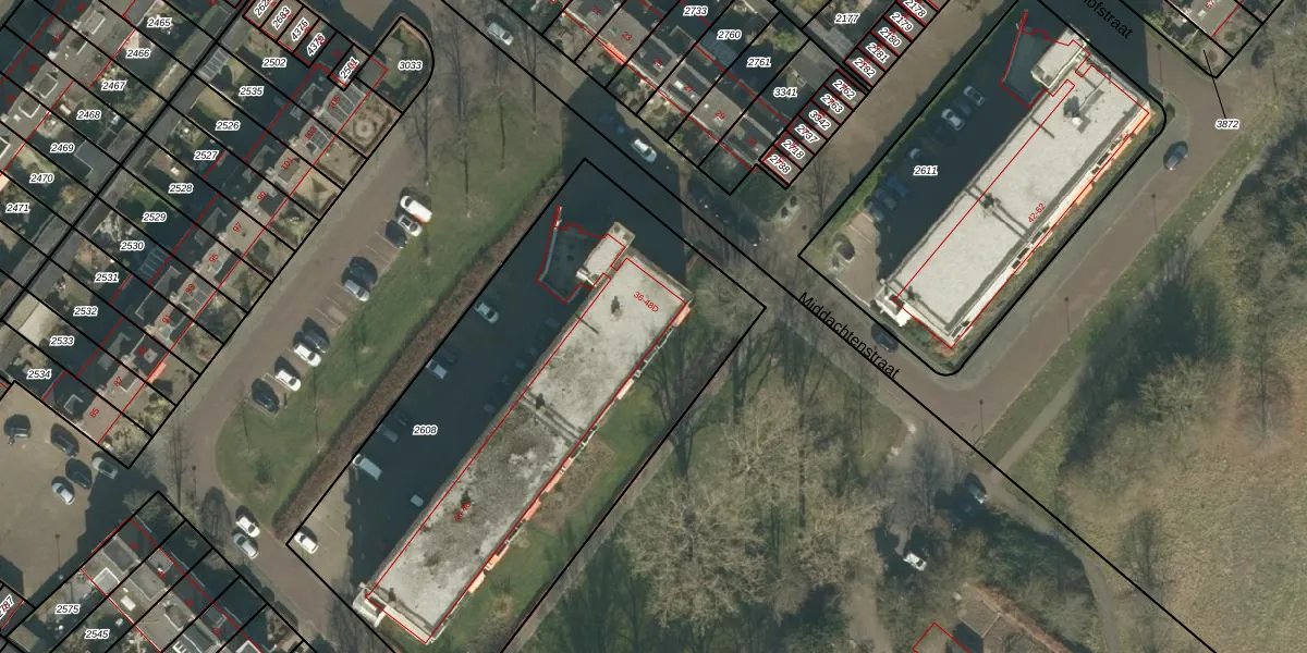 Het perceel waarop Middachtenstraat 36-D staat heeft een oppervlakte van 2800 m². Dit is een zeer groot perceel. De perceeloppervlakte wordt geregistreerd door het Kadaster. Gedetailleerde informatie over de maten van dit perceel kunt u vinden in het rapport Kadastrale kaart met maatvoering van Middachtenstraat 36-D.