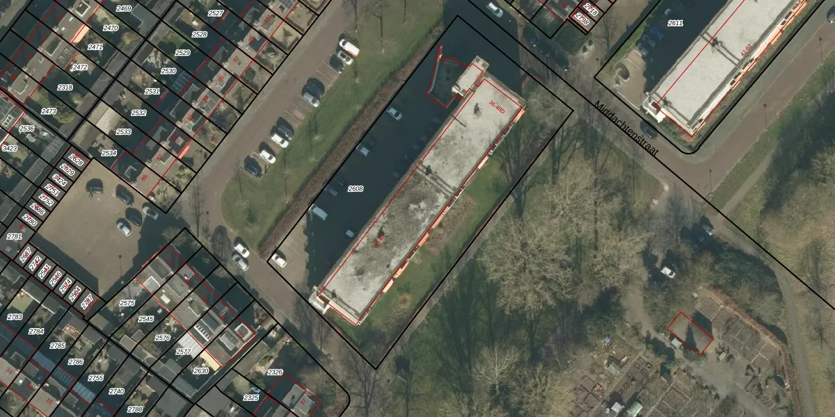 Het perceel waarop Middachtenstraat 42-B staat heeft een oppervlakte van 2800 m². Dit is een zeer groot perceel. De perceeloppervlakte wordt geregistreerd door het Kadaster. Gedetailleerde informatie over de maten van dit perceel kunt u vinden in het rapport Kadastrale kaart met maatvoering van Middachtenstraat 42-B.