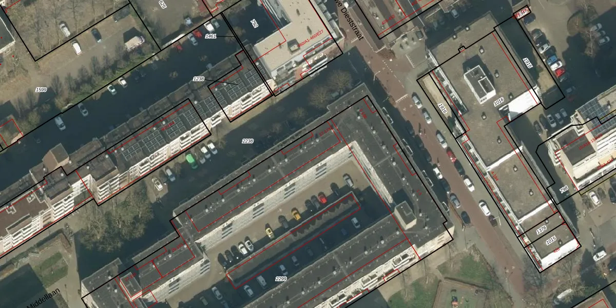 Het perceel waarop Middellaan 121 staat heeft een oppervlakte van 5983 m². Dit is een zeer groot perceel. De perceeloppervlakte wordt geregistreerd door het Kadaster. Gedetailleerde informatie over de maten van dit perceel kunt u vinden in het rapport Kadastrale kaart met maatvoering van Middellaan 121.