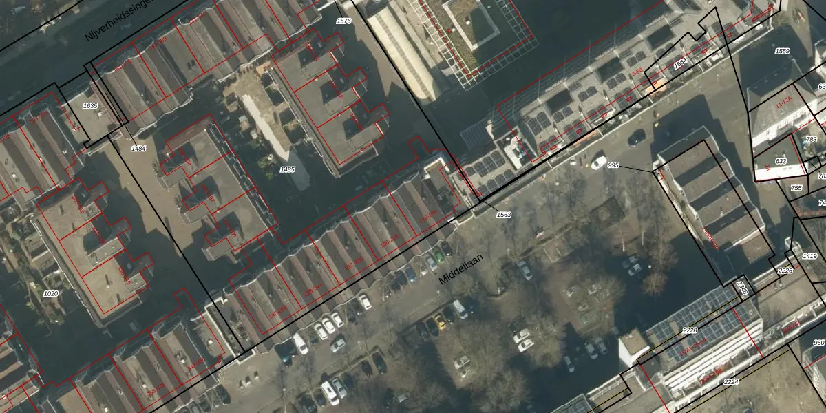 Het perceel waarop Middellaan 192 staat heeft een oppervlakte van 5154 m². Dit is een zeer groot perceel. De perceeloppervlakte wordt geregistreerd door het Kadaster. Gedetailleerde informatie over de maten van dit perceel kunt u vinden in het rapport Kadastrale kaart met maatvoering van Middellaan 192.