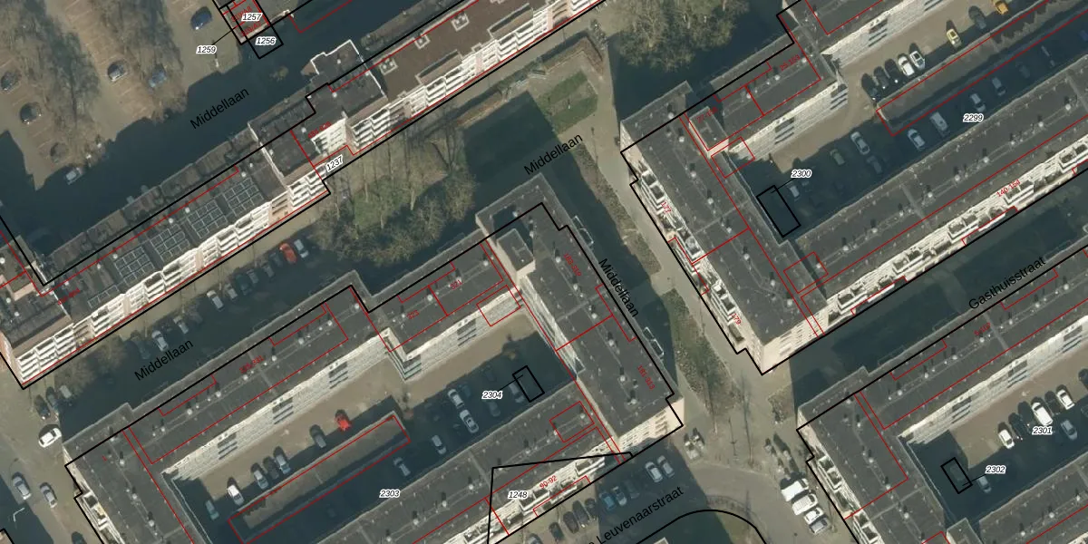 Middellaan 221 is gelegen op kadastraal perceel BDA00F2303. Deze kadastrale aanduiding is uniek en wordt gebruikt door het Kadaster om eigendomsrechten en andere zakelijke rechten vast te leggen. Het perceel maakt onderdeel uit van de kadastrale gemeente Breda.