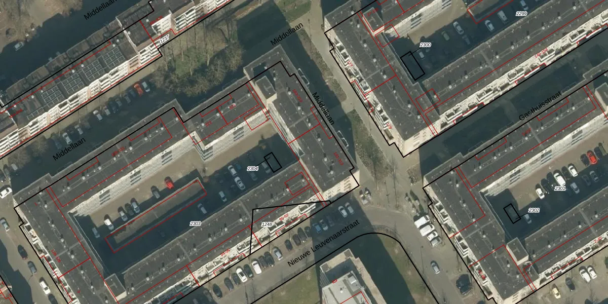 Middellaan 303 is gelegen op kadastraal perceel BDA00F2303. Deze kadastrale aanduiding is uniek en wordt gebruikt door het Kadaster om eigendomsrechten en andere zakelijke rechten vast te leggen. Het perceel maakt onderdeel uit van de kadastrale gemeente Breda.