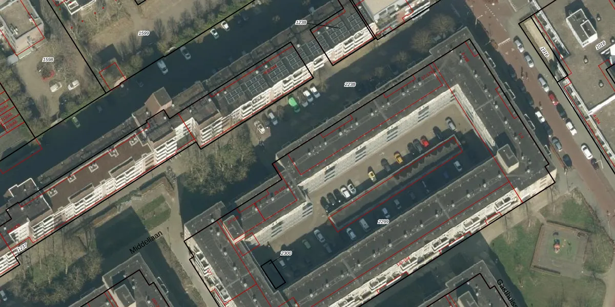 Het perceel waarop Middellaan 55 staat heeft een oppervlakte van 5983 m². Dit is een zeer groot perceel. De perceeloppervlakte wordt geregistreerd door het Kadaster. Gedetailleerde informatie over de maten van dit perceel kunt u vinden in het rapport Kadastrale kaart met maatvoering van Middellaan 55.