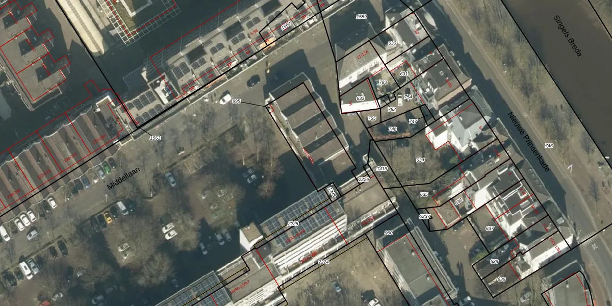 Middellaan 9 is gelegen op kadastraal perceel BDA00F995. Deze kadastrale aanduiding is uniek en wordt gebruikt door het Kadaster om eigendomsrechten en andere zakelijke rechten vast te leggen. Het perceel maakt onderdeel uit van de kadastrale gemeente Breda.