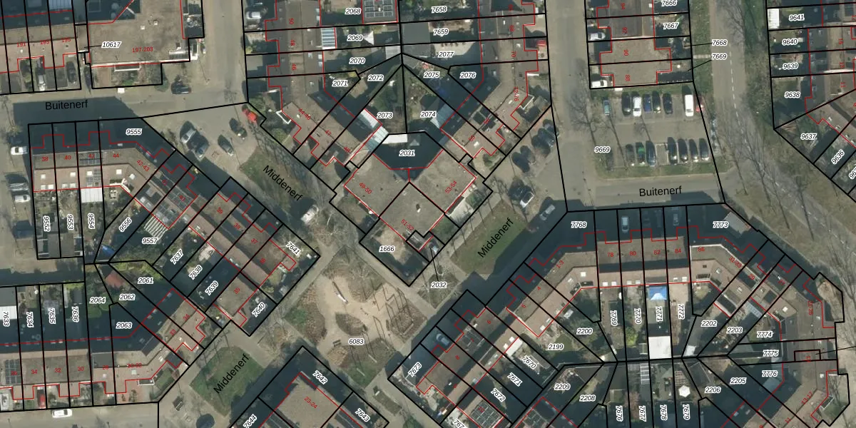 Middenerf 52 is gelegen op kadastraal perceel BDA00H1666. Deze kadastrale aanduiding is uniek en wordt gebruikt door het Kadaster om eigendomsrechten en andere zakelijke rechten vast te leggen. Het perceel maakt onderdeel uit van de kadastrale gemeente Breda.