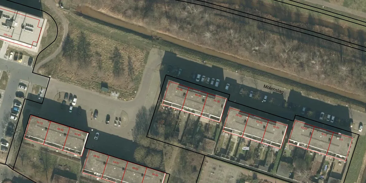 Het perceel waarop Molenslag 42 staat heeft een oppervlakte van 3830 m². Dit is een zeer groot perceel. De perceeloppervlakte wordt geregistreerd door het Kadaster. Gedetailleerde informatie over de maten van dit perceel kunt u vinden in het rapport Kadastrale kaart met maatvoering van Molenslag 42.