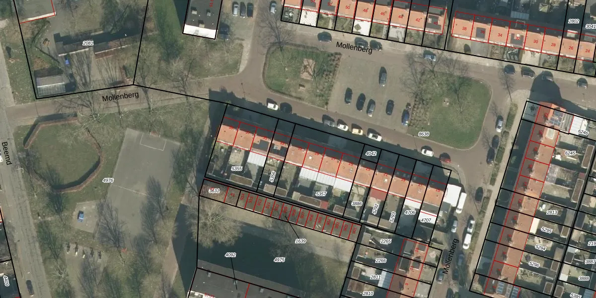 Het perceel waarop Mollenberg 31 staat heeft een oppervlakte van 629 m². Dit is een groot perceel. De perceeloppervlakte wordt geregistreerd door het Kadaster. Gedetailleerde informatie over de maten van dit perceel kunt u vinden in het rapport Kadastrale kaart met maatvoering van Mollenberg 31.
