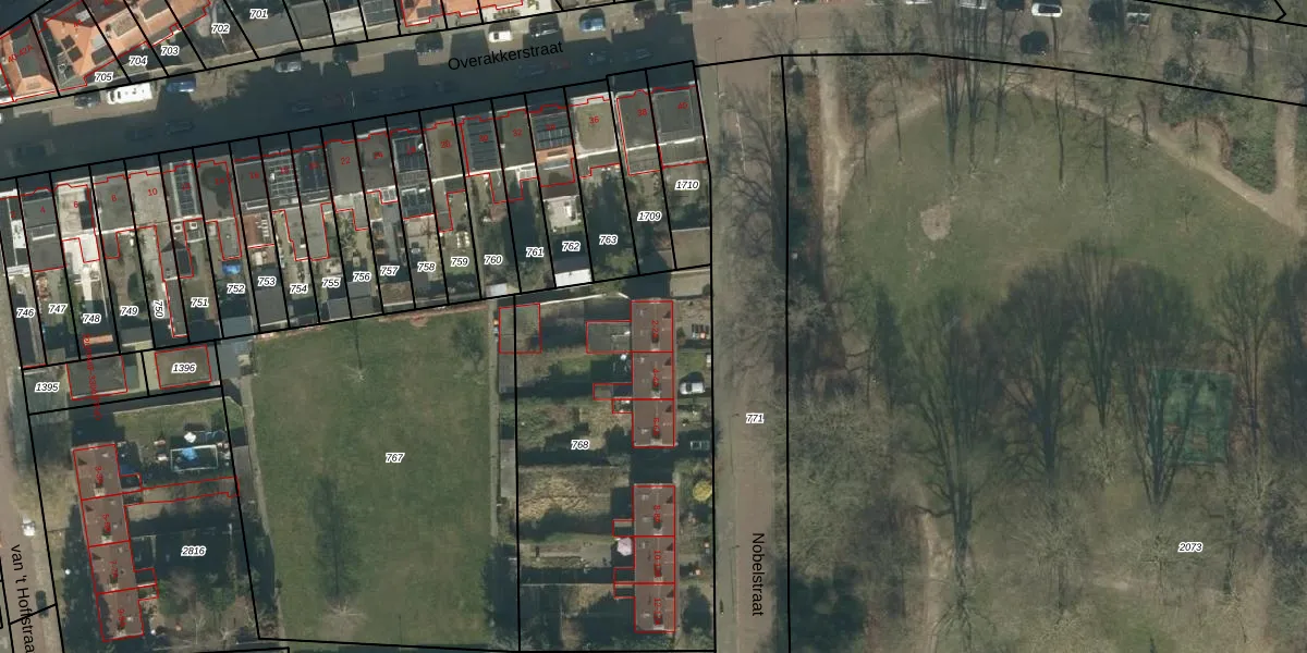 Het perceel waarop Nobelstraat 2 staat heeft een oppervlakte van 1710 m². Dit is een zeer groot perceel. De perceeloppervlakte wordt geregistreerd door het Kadaster. Gedetailleerde informatie over de maten van dit perceel kunt u vinden in het rapport Kadastrale kaart met maatvoering van Nobelstraat 2.
