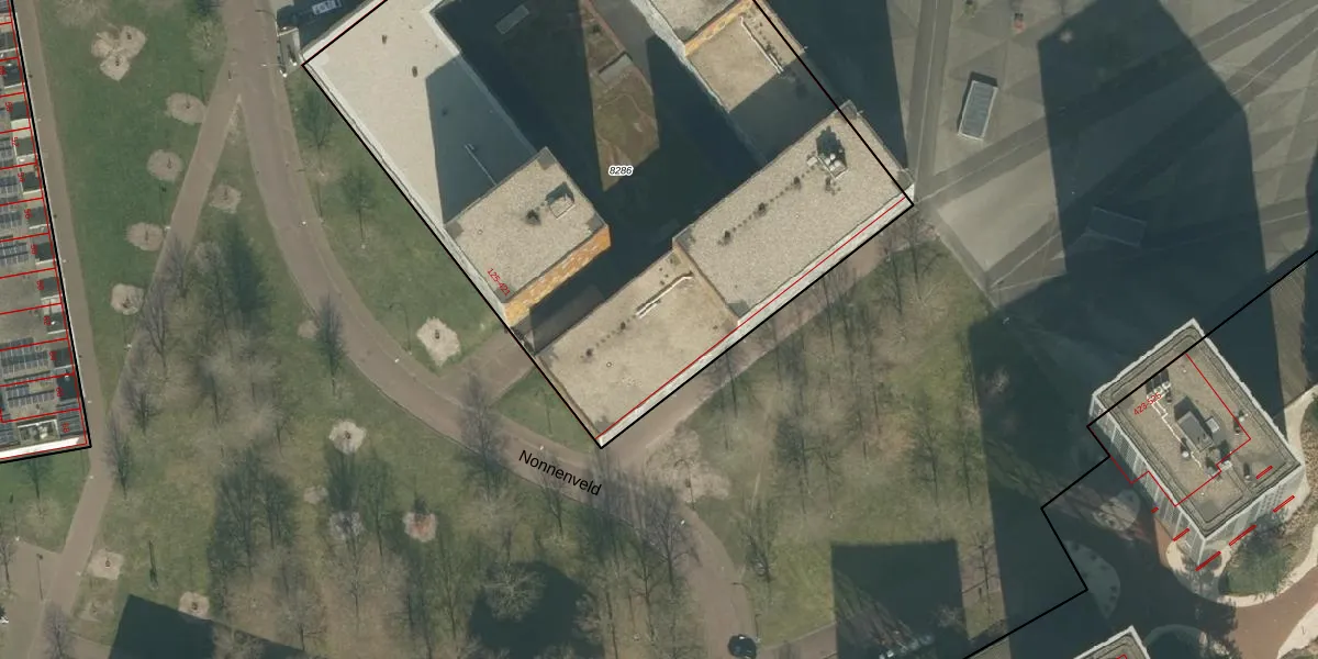 Het perceel waarop Nonnenveld 187 staat heeft een oppervlakte van 4428 m². Dit is een zeer groot perceel. De perceeloppervlakte wordt geregistreerd door het Kadaster. Gedetailleerde informatie over de maten van dit perceel kunt u vinden in het rapport Kadastrale kaart met maatvoering van Nonnenveld 187.