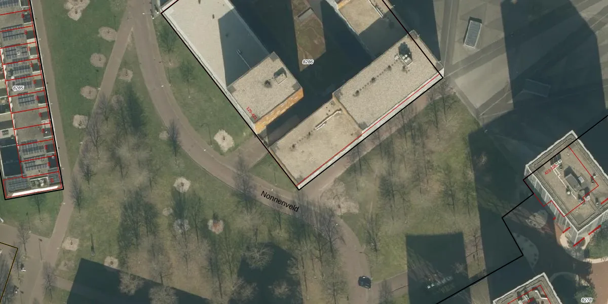 Het perceel waarop Nonnenveld 335 staat heeft een oppervlakte van 4428 m². Dit is een zeer groot perceel. De perceeloppervlakte wordt geregistreerd door het Kadaster. Gedetailleerde informatie over de maten van dit perceel kunt u vinden in het rapport Kadastrale kaart met maatvoering van Nonnenveld 335.