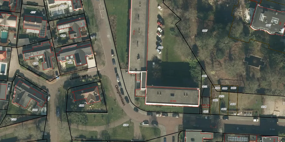 Het perceel waarop Okeghemlaan 17-V staat heeft een oppervlakte van 4560 m². Dit is een zeer groot perceel. De perceeloppervlakte wordt geregistreerd door het Kadaster. Gedetailleerde informatie over de maten van dit perceel kunt u vinden in het rapport Kadastrale kaart met maatvoering van Okeghemlaan 17-V.