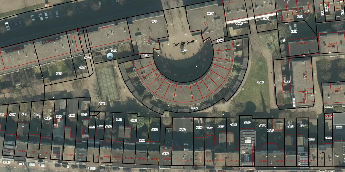 Omegaplein 43 is gelegen op kadastraal perceel BDA00B8094. Deze kadastrale aanduiding is uniek en wordt gebruikt door het Kadaster om eigendomsrechten en andere zakelijke rechten vast te leggen. Het perceel maakt onderdeel uit van de kadastrale gemeente Breda.