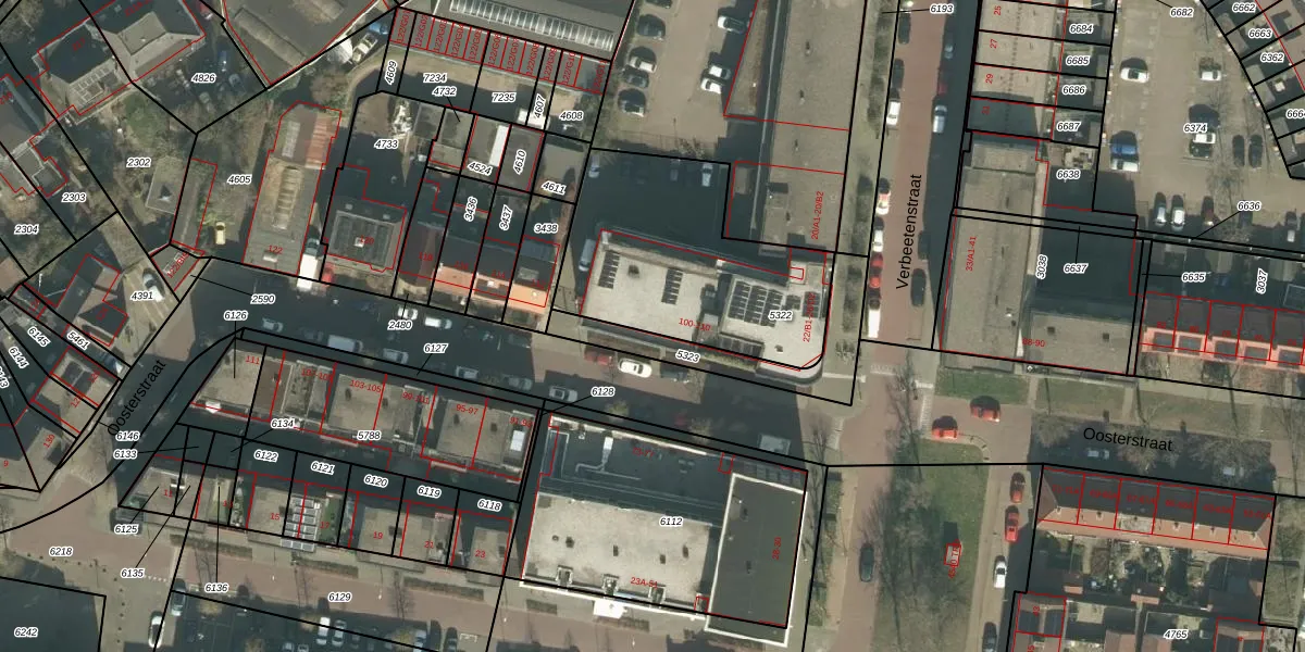 Oosterstraat 108 is gelegen op kadastraal perceel PCH00I5322. Deze kadastrale aanduiding is uniek en wordt gebruikt door het Kadaster om eigendomsrechten en andere zakelijke rechten vast te leggen. Het perceel maakt onderdeel uit van de kadastrale gemeente Princenhage.