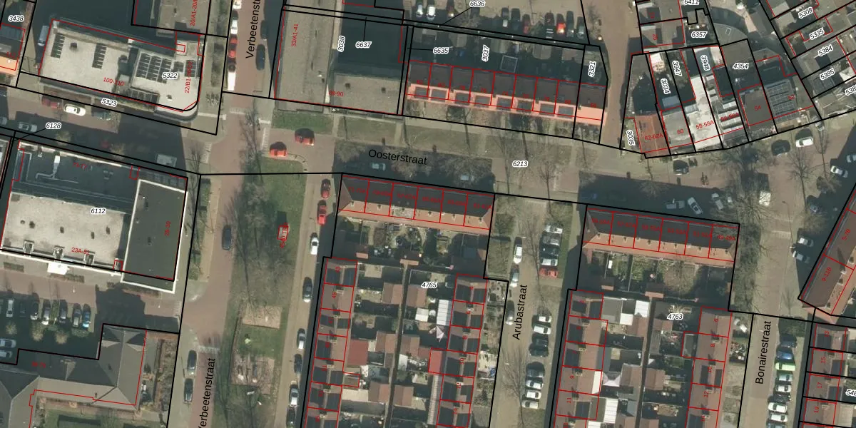 Het perceel waarop Oosterstraat 65-A staat heeft een oppervlakte van 3267 m². Dit is een zeer groot perceel. De perceeloppervlakte wordt geregistreerd door het Kadaster. Gedetailleerde informatie over de maten van dit perceel kunt u vinden in het rapport Kadastrale kaart met maatvoering van Oosterstraat 65-A.