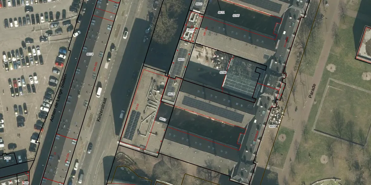 Het perceel waarop Parade 14-B16 staat heeft een oppervlakte van 4535 m². Dit is een zeer groot perceel. De perceeloppervlakte wordt geregistreerd door het Kadaster. Gedetailleerde informatie over de maten van dit perceel kunt u vinden in het rapport Kadastrale kaart met maatvoering van Parade 14-B16.