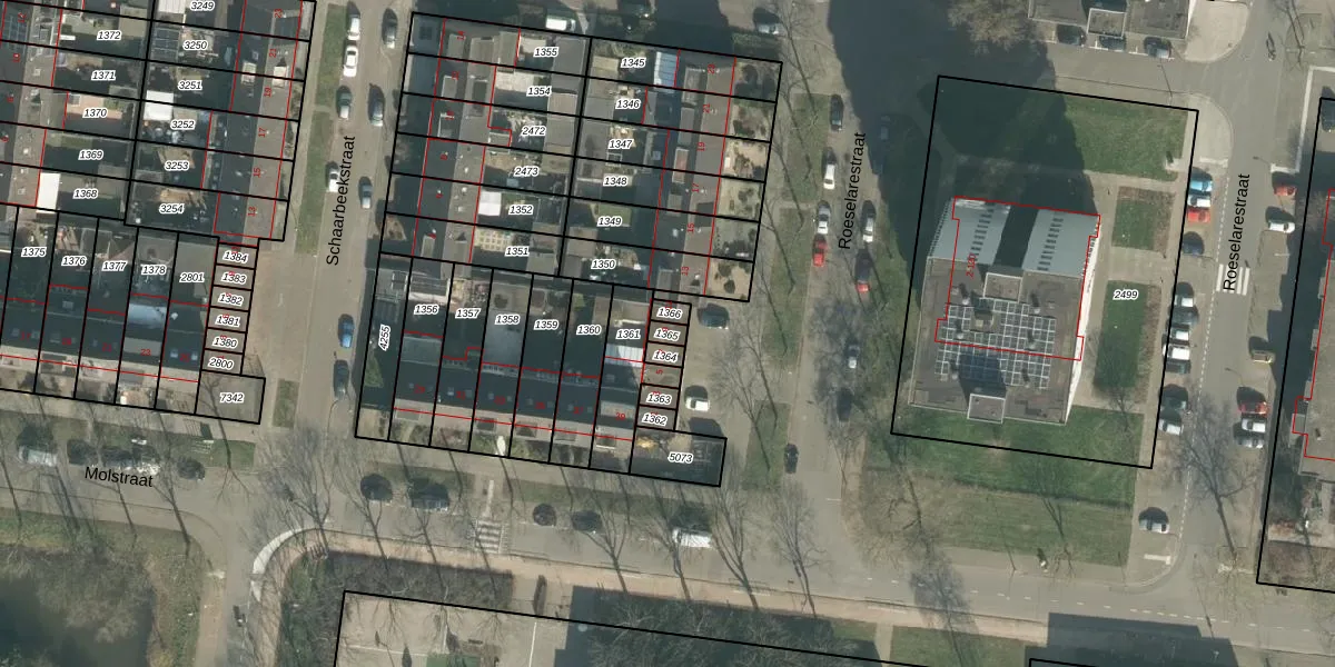 Gebruik de zoekbalk of klik op een perceel voor informatie over de adressen binnen dit perceel.