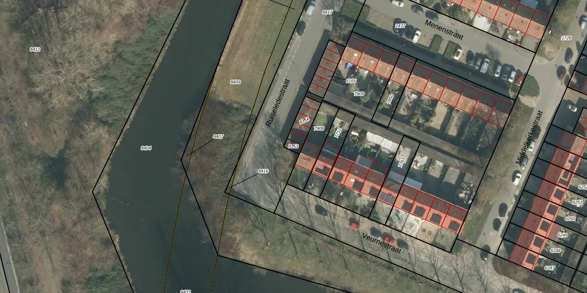 Het perceel waarop Ruiseledestraat 2 staat heeft een oppervlakte van 19 m². Dit is een klein perceel. De perceeloppervlakte wordt geregistreerd door het Kadaster. Gedetailleerde informatie over de maten van dit perceel kunt u vinden in het rapport Kadastrale kaart met maatvoering van Ruiseledestraat 2.