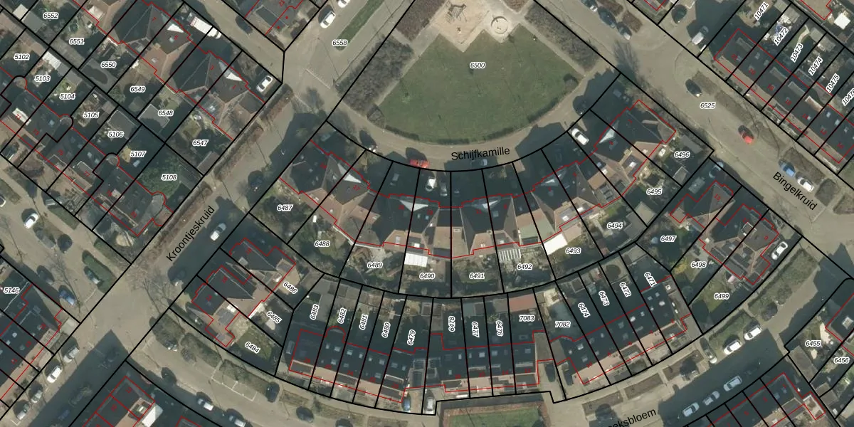 Schijfkamille 13 is gelegen op kadastraal perceel BDA00H6490. Deze kadastrale aanduiding is uniek en wordt gebruikt door het Kadaster om eigendomsrechten en andere zakelijke rechten vast te leggen. Het perceel maakt onderdeel uit van de kadastrale gemeente Breda.