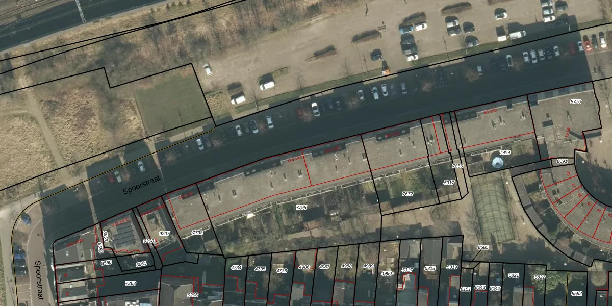 Het perceel waarop Spoorstraat 122 staat heeft een oppervlakte van 1722 m². Dit is een zeer groot perceel. De perceeloppervlakte wordt geregistreerd door het Kadaster. Gedetailleerde informatie over de maten van dit perceel kunt u vinden in het rapport Kadastrale kaart met maatvoering van Spoorstraat 122.