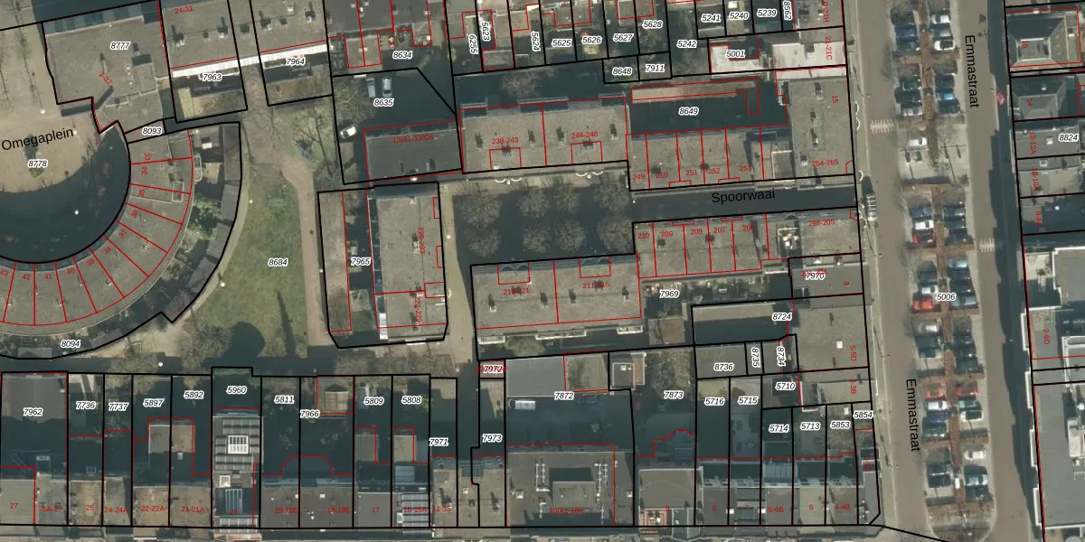 Spoorwaai 216 is gelegen op kadastraal perceel BDA00B7969. Deze kadastrale aanduiding is uniek en wordt gebruikt door het Kadaster om eigendomsrechten en andere zakelijke rechten vast te leggen. Het perceel maakt onderdeel uit van de kadastrale gemeente Breda.