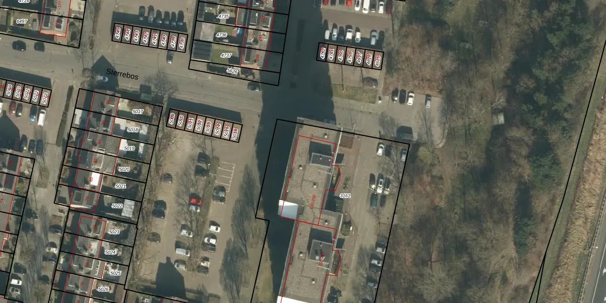 Het perceel waarop Sterrebos 184 staat heeft een oppervlakte van 3100 m². Dit is een zeer groot perceel. De perceeloppervlakte wordt geregistreerd door het Kadaster. Gedetailleerde informatie over de maten van dit perceel kunt u vinden in het rapport Kadastrale kaart met maatvoering van Sterrebos 184.