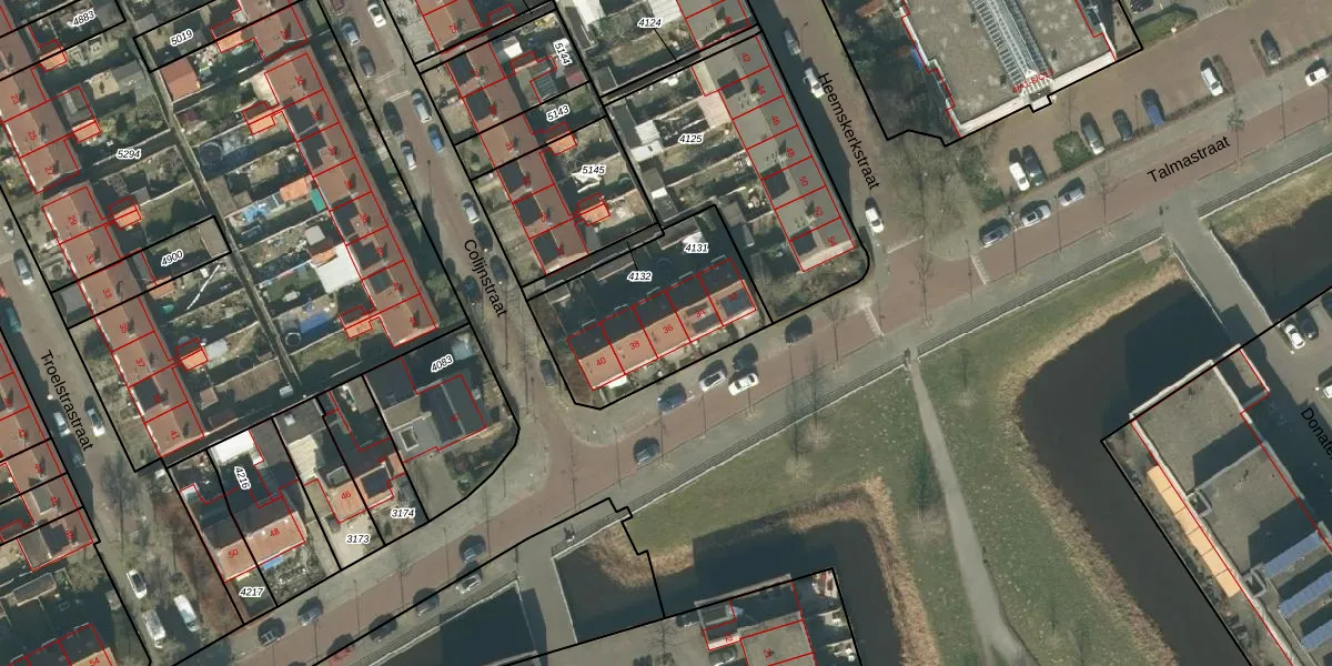 Het perceel waarop Talmastraat 36 staat heeft een oppervlakte van 613 m². Dit is een groot perceel. De perceeloppervlakte wordt geregistreerd door het Kadaster. Gedetailleerde informatie over de maten van dit perceel kunt u vinden in het rapport Kadastrale kaart met maatvoering van Talmastraat 36.