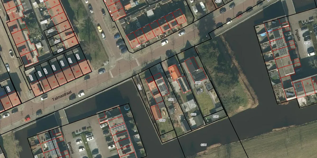 Het perceel waarop Talmastraat 63 staat heeft een oppervlakte van 412 m². Dit is een groot perceel. De perceeloppervlakte wordt geregistreerd door het Kadaster. Gedetailleerde informatie over de maten van dit perceel kunt u vinden in het rapport Kadastrale kaart met maatvoering van Talmastraat 63.