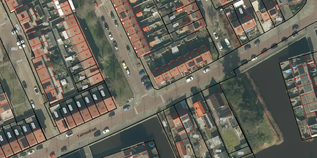 Het perceel waarop Talmastraat 66 staat heeft een oppervlakte van 3698 m². Dit is een zeer groot perceel. De perceeloppervlakte wordt geregistreerd door het Kadaster. Gedetailleerde informatie over de maten van dit perceel kunt u vinden in het rapport Kadastrale kaart met maatvoering van Talmastraat 66.