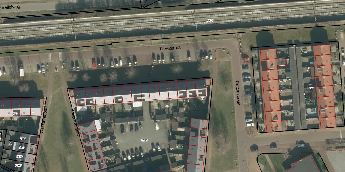 Het perceel waarop Texelstraat 30 staat heeft een oppervlakte van 4716 m². Dit is een zeer groot perceel. De perceeloppervlakte wordt geregistreerd door het Kadaster. Gedetailleerde informatie over de maten van dit perceel kunt u vinden in het rapport Kadastrale kaart met maatvoering van Texelstraat 30.
