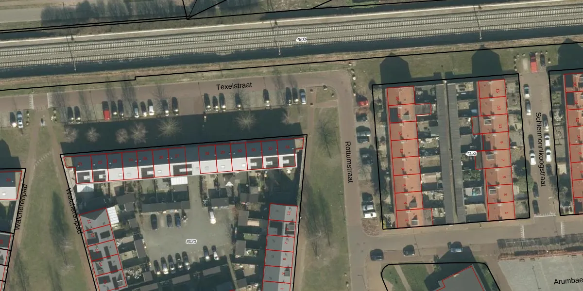 Het perceel waarop Texelstraat 33 staat heeft een oppervlakte van 4716 m². Dit is een zeer groot perceel. De perceeloppervlakte wordt geregistreerd door het Kadaster. Gedetailleerde informatie over de maten van dit perceel kunt u vinden in het rapport Kadastrale kaart met maatvoering van Texelstraat 33.