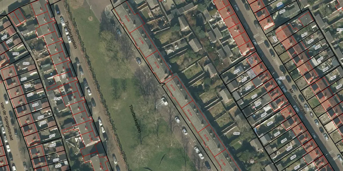 Het perceel waarop Thorbeckeplein 25 staat heeft een oppervlakte van 8153 m². Dit is een zeer groot perceel. De perceeloppervlakte wordt geregistreerd door het Kadaster. Gedetailleerde informatie over de maten van dit perceel kunt u vinden in het rapport Kadastrale kaart met maatvoering van Thorbeckeplein 25.