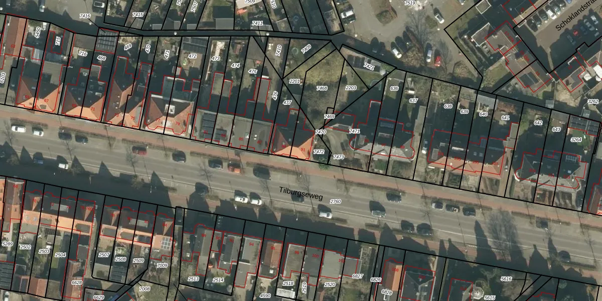 Tilburgseweg 91 is gelegen op kadastraal perceel BDA00G7472. Deze kadastrale aanduiding is uniek en wordt gebruikt door het Kadaster om eigendomsrechten en andere zakelijke rechten vast te leggen. Het perceel maakt onderdeel uit van de kadastrale gemeente Breda.
