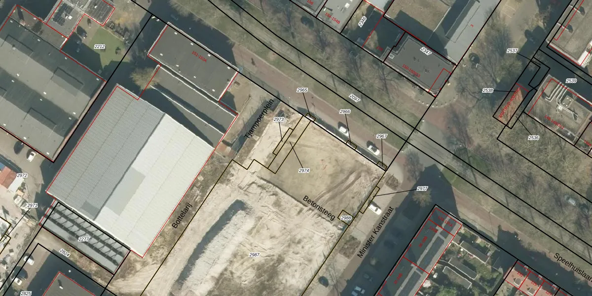 Het perceel waarop Tjampoerplein 2 staat heeft een oppervlakte van 3715 m². Dit is een zeer groot perceel. De perceeloppervlakte wordt geregistreerd door het Kadaster. Gedetailleerde informatie over de maten van dit perceel kunt u vinden in het rapport Kadastrale kaart met maatvoering van Tjampoerplein 2.