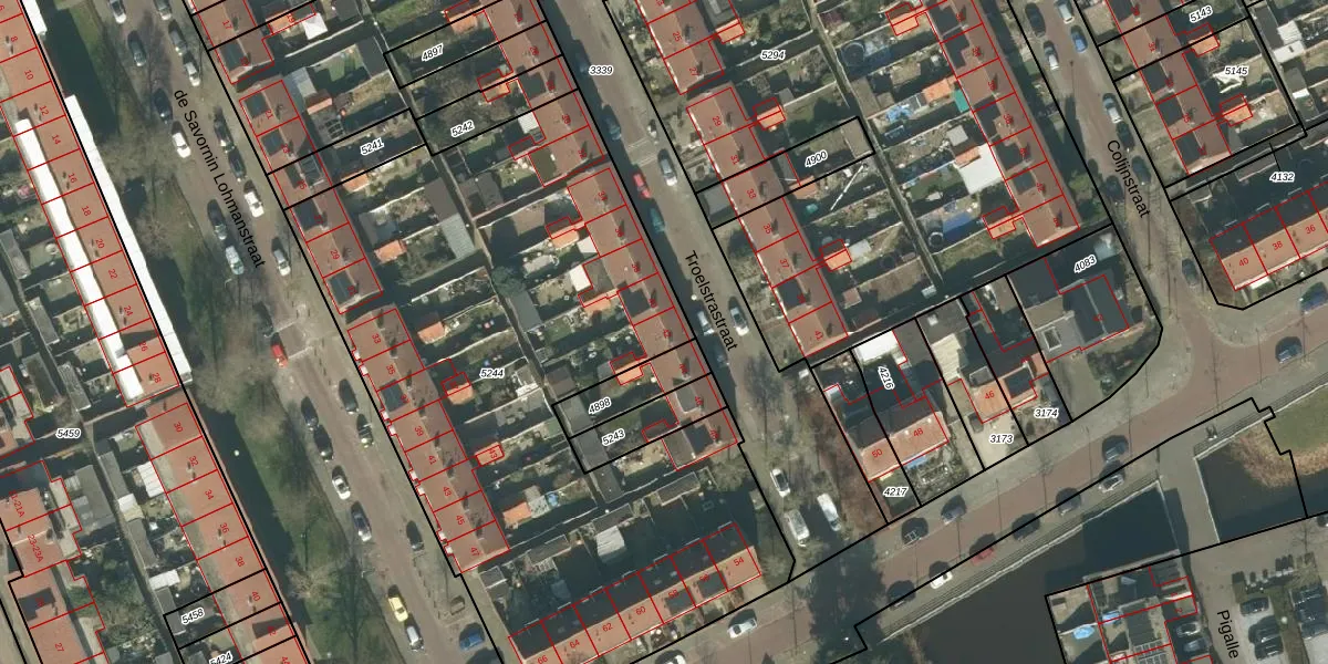 Het perceel waarop Troelstrastraat 42 staat heeft een oppervlakte van 3698 m². Dit is een zeer groot perceel. De perceeloppervlakte wordt geregistreerd door het Kadaster. Gedetailleerde informatie over de maten van dit perceel kunt u vinden in het rapport Kadastrale kaart met maatvoering van Troelstrastraat 42.